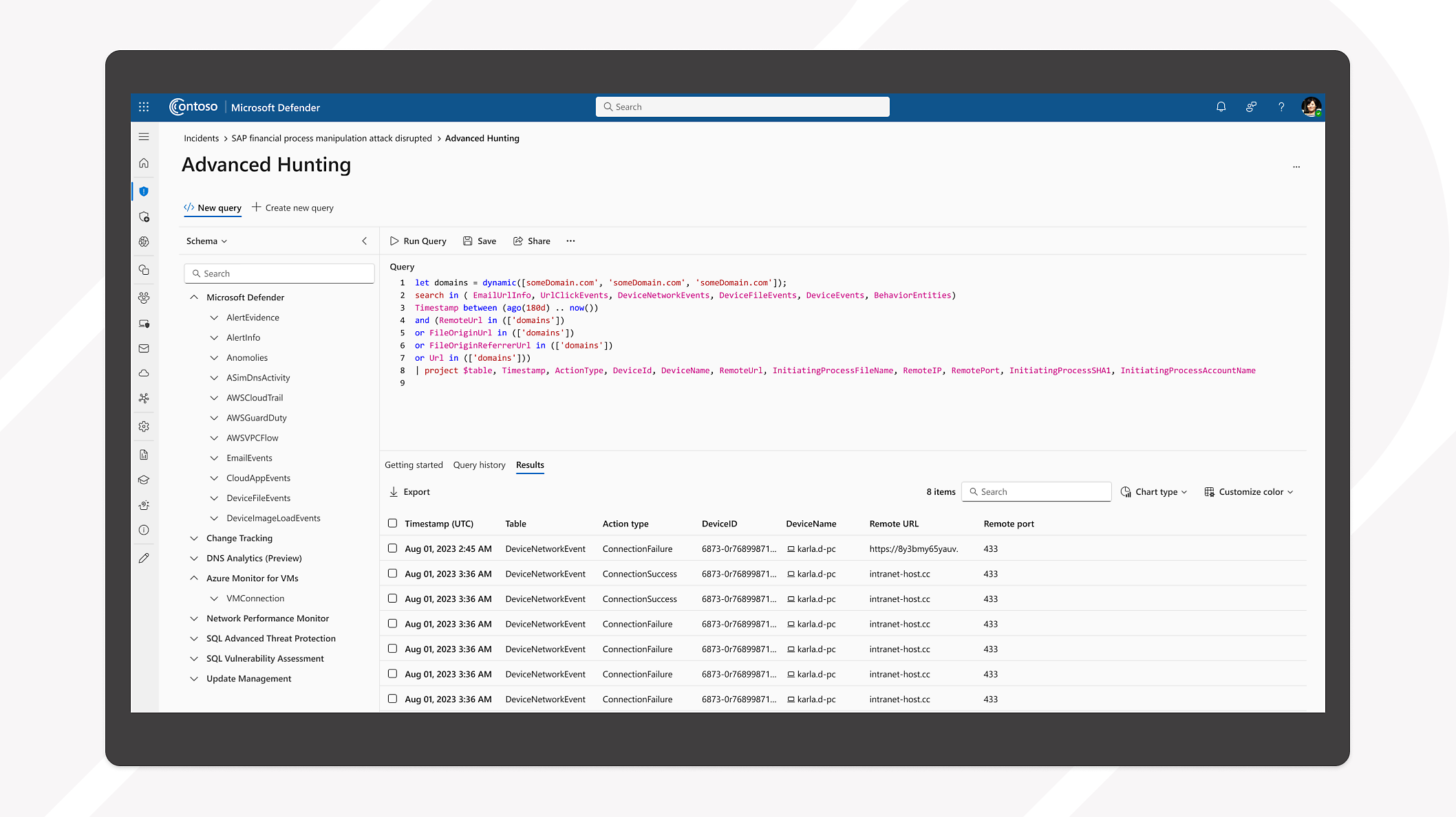通过自动 self-healing 更小的任务(如设备清理)来减少工作负荷。结合使用自定义检测和 Kusto 查询语言 (KQL) 查询,在环境中生成自动化响应来处理重复警报。
